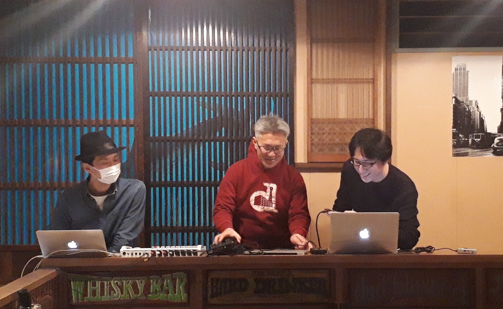 写真は、左から音響担当のハヤシラジオ企画さん、DJヨシナガ、DJ三鷹サウンドさんです。