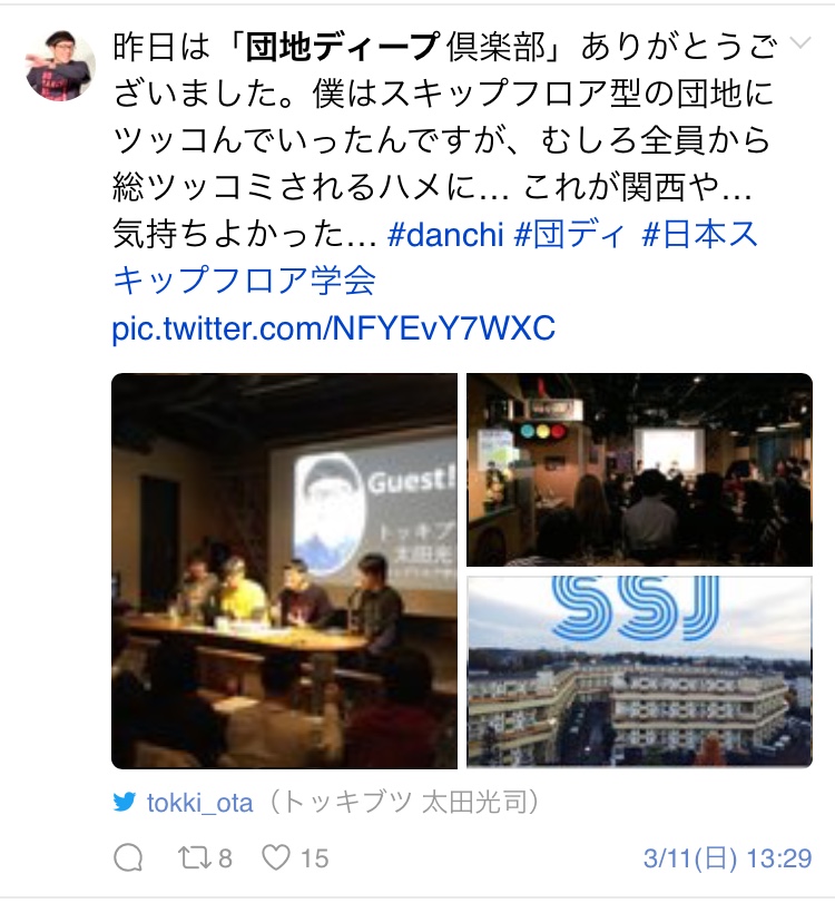 次は「団地の出来事」ゲストはお笑い芸人にして日本スキップフロア学会会長のトッキブツ太田くんによるスキップフロアがカッコイイ団地の紹介。