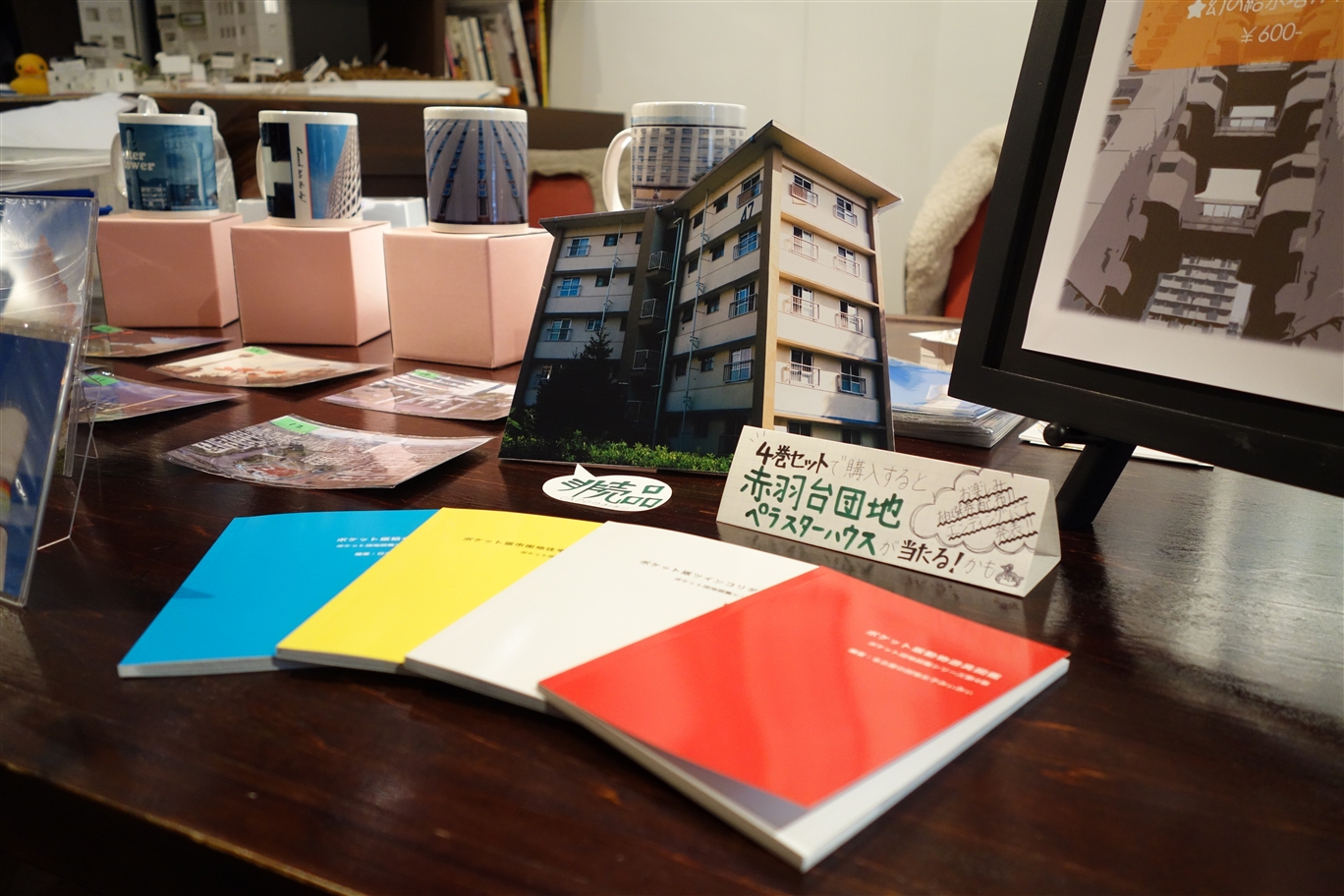 ↑グッズ販売は、ポケット団地図鑑、マグカップ、缶バッジ、ポストカード!