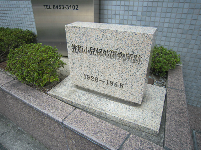 曲がる場所の目印。『笠原小児保健研究所跡』石碑。